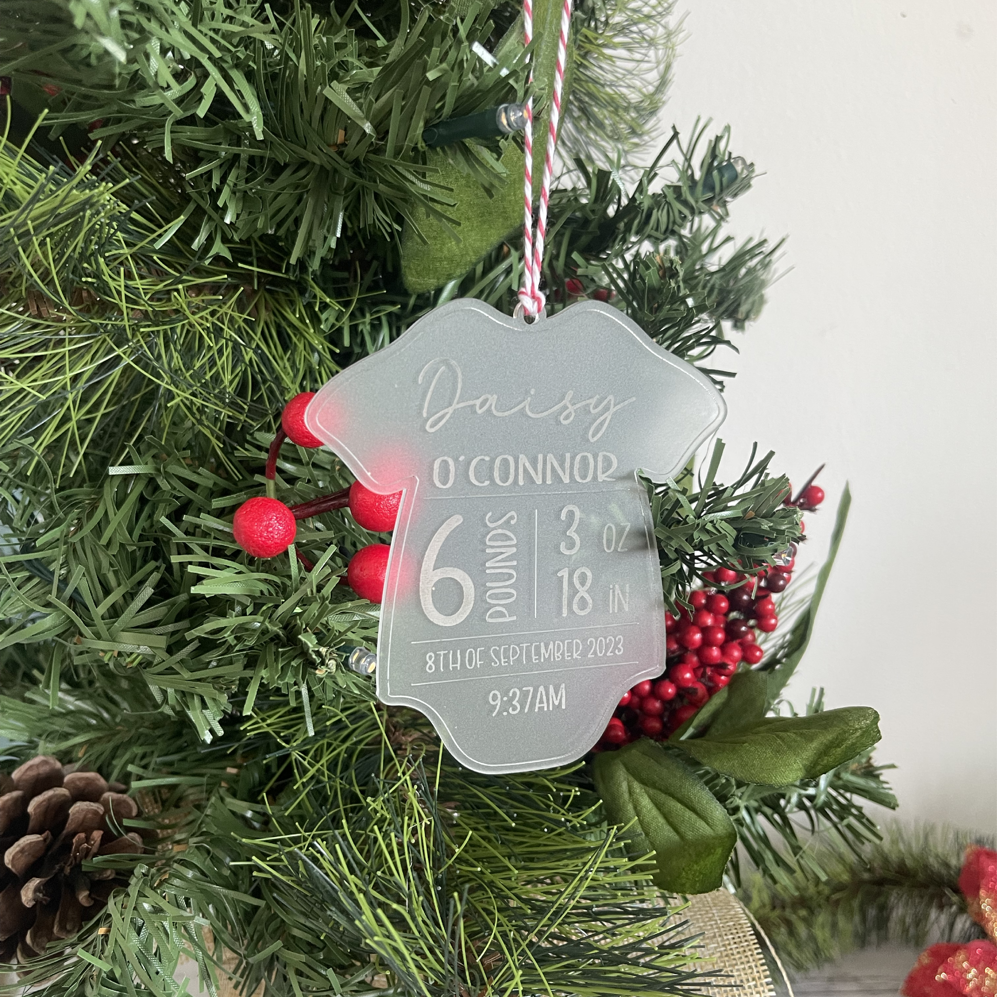 Capture the magic of your baby's arrival with our personalised 'Baby Birth Stat' bodysuit-shaped Christmas ornaments!