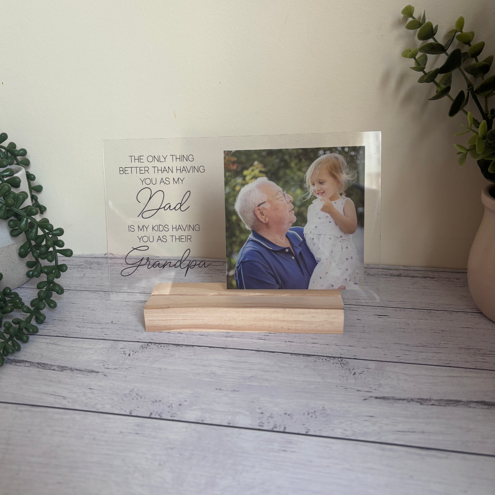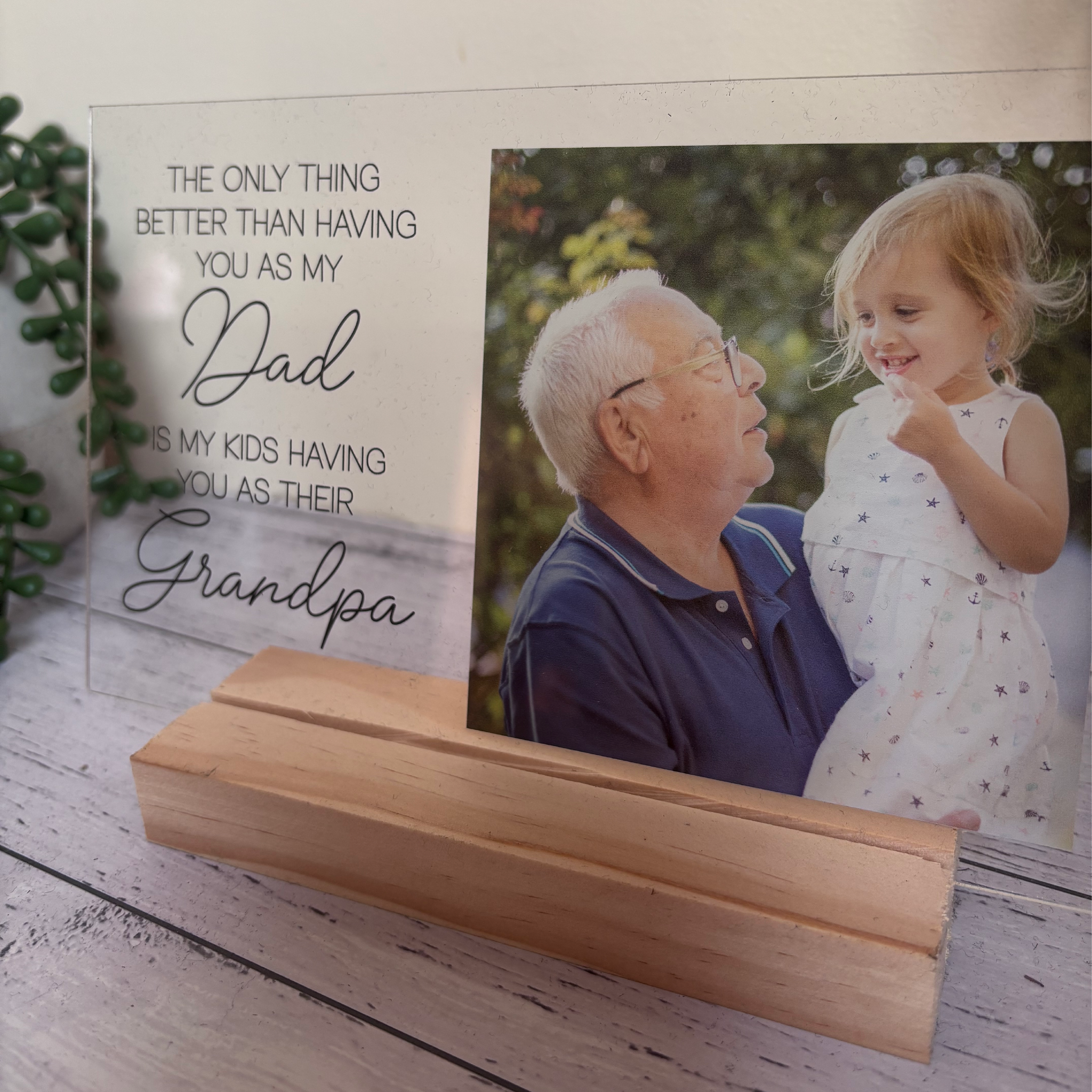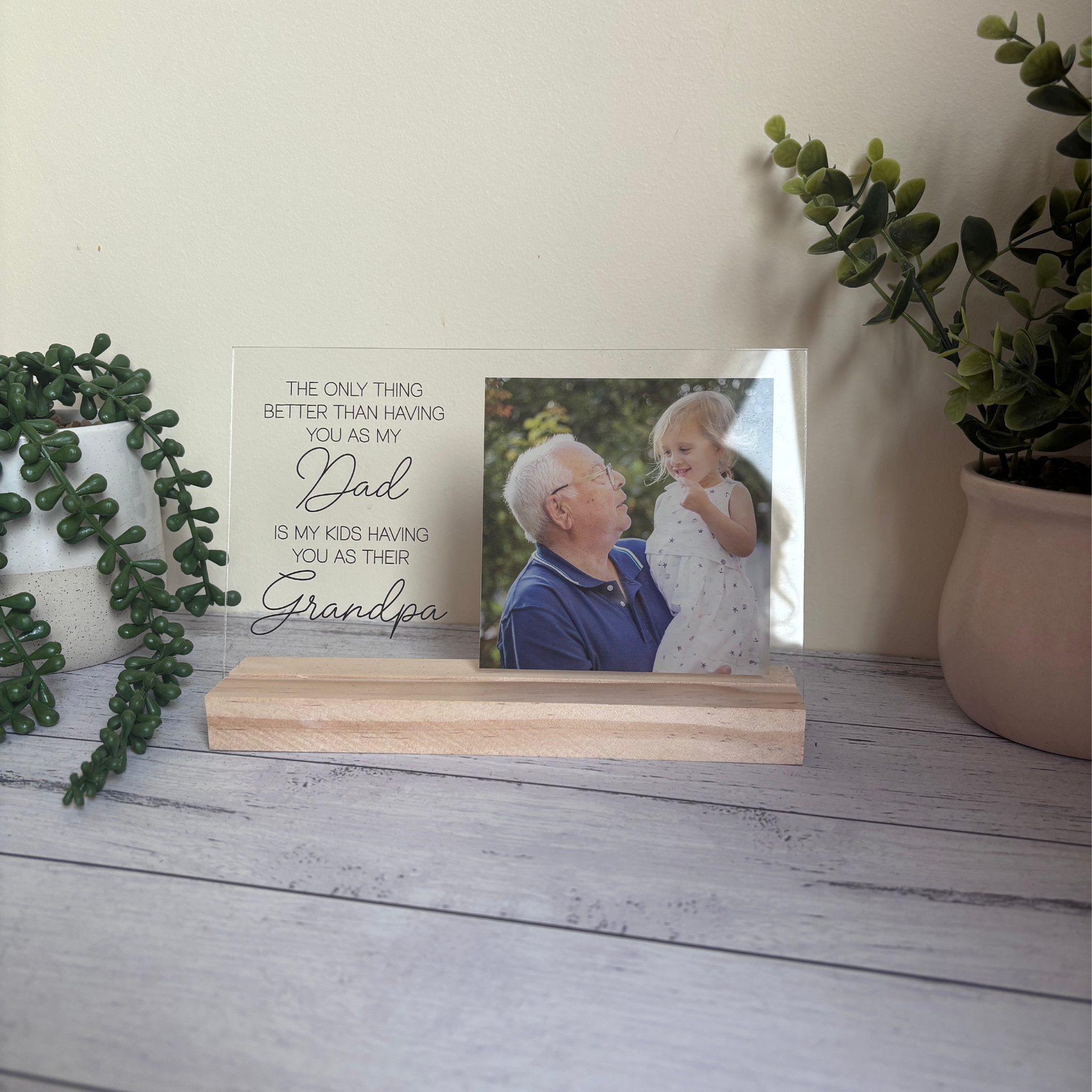 Celebrate the love between generations with this beautifully personalised acrylic photo plaque, designed to bring tears of joy and smiles of love. Featuring your chosen photo and a heartfelt quote, this is the perfect gift for Dad, Poppy or Grandpa that he'll treasure forever.