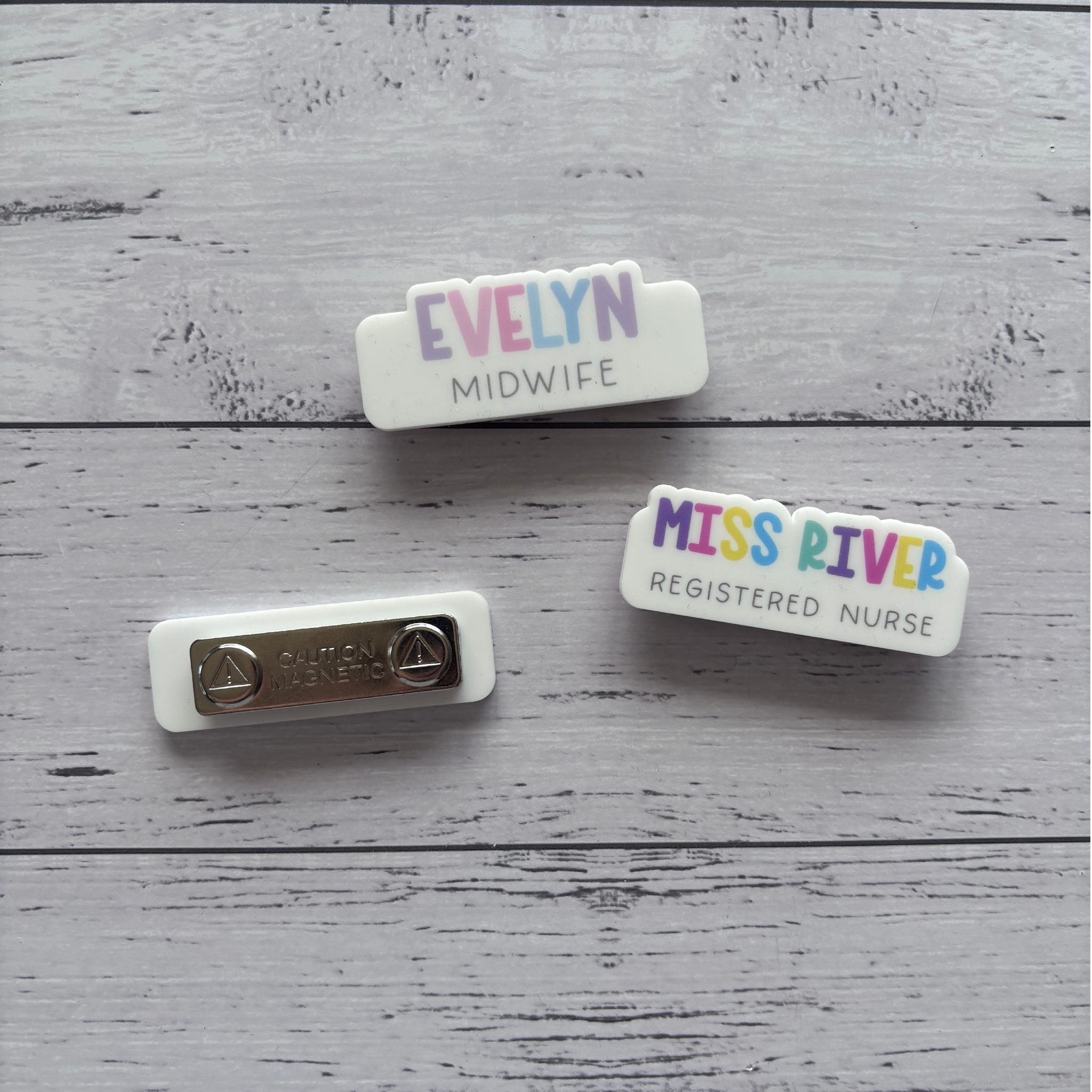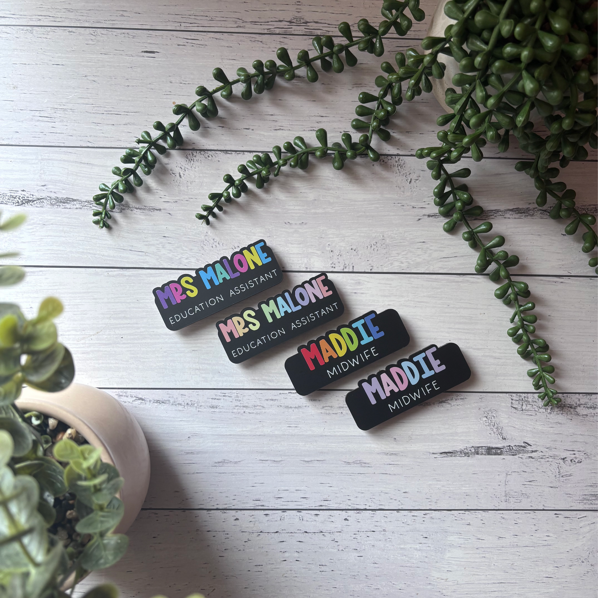 Add a colourful touch to your workwear with our beautifully personalised name badges! These custom acrylic name tags are printed with your name and occupation in a colour palette of your choice, making them both functional and stylish.