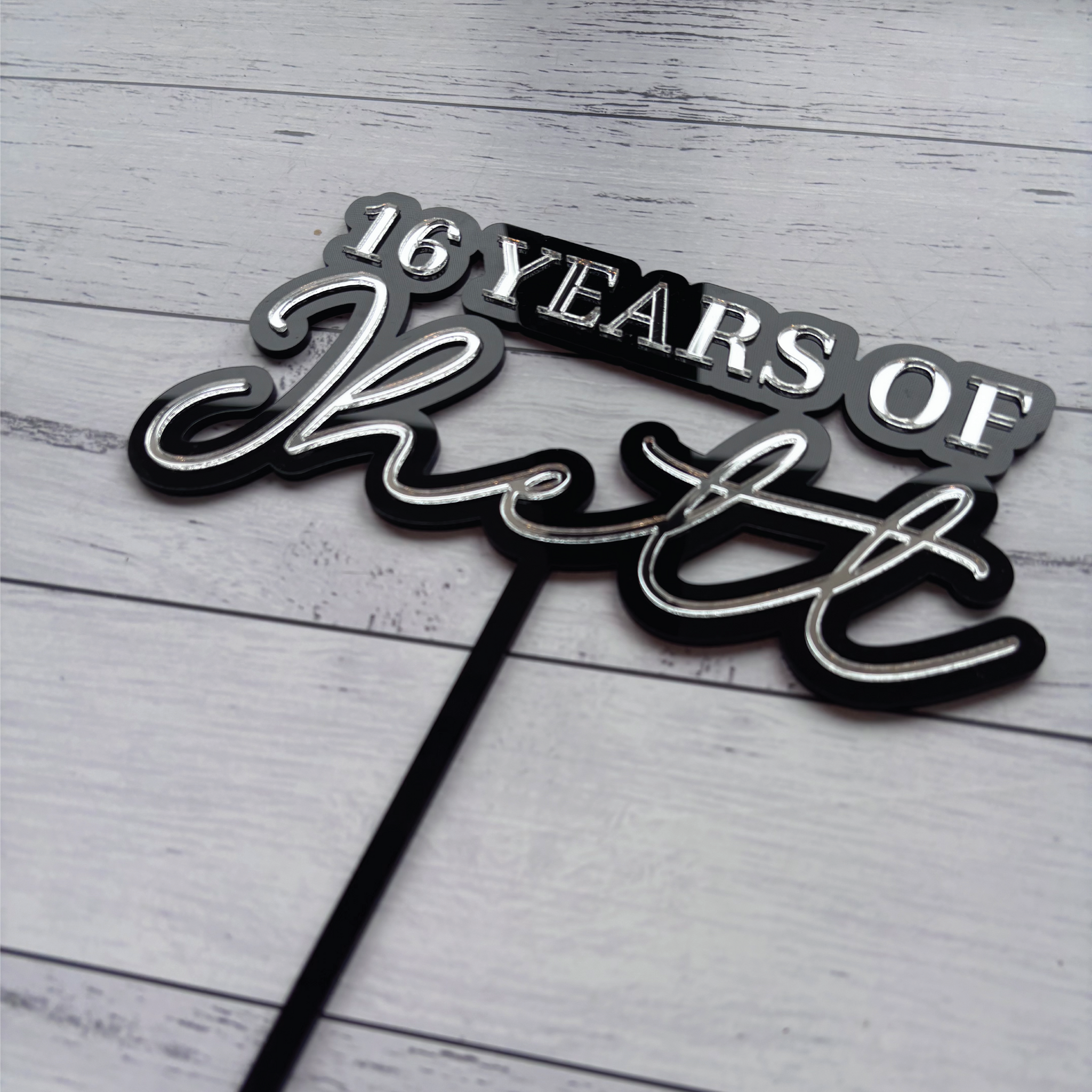 Layered Design: A beautiful 3D effect is created with a bold black acrylic base and a shimmering mirrored acrylic top layer. The "YEARS OF" text is bold, while the name is in an elegant script font.